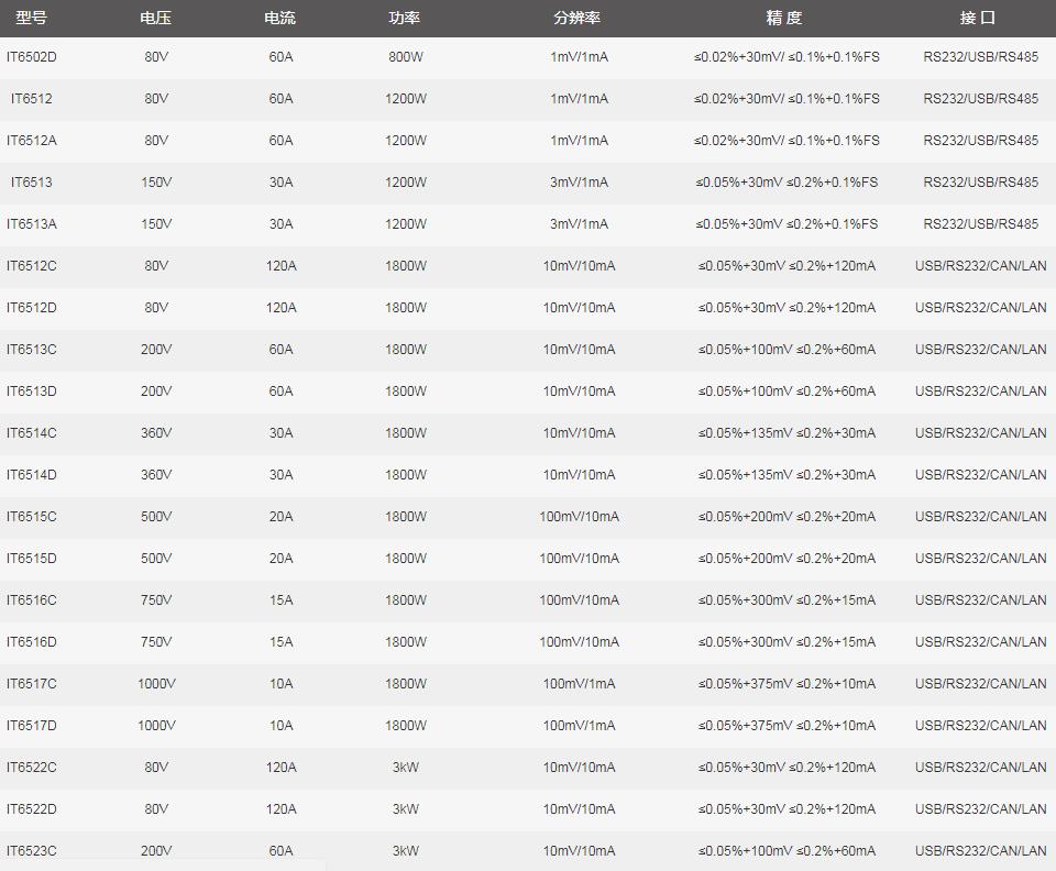 IT6500系列寬范圍大功率直流電源提供給用戶非常寬廣的選擇范圍,全系列包含從800W到6kW,以及高達1000V、240A的輸出范圍,同時擁有超寬的電壓、電流使用范圍。不但有豐富測量功能、高速響應的IT6500C系列,同時也提供高性能、穩定輸出的IT6500D系列,用戶可以根據需求,輕松選擇。其應用領域包括汽車、綠色能源、高速測試、大功率測試等多個方面,是一款功能豐富、性能優異、適用廣泛的直流電源。