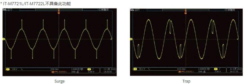 IT-M7700系列提供突波/陷波的模擬功能,用戶可以根據需求在輸出正弦波的基礎上加上突波/陷波來模擬電路系統中電壓的異常波動,從而測試待測物在此種環境下的使用情況。