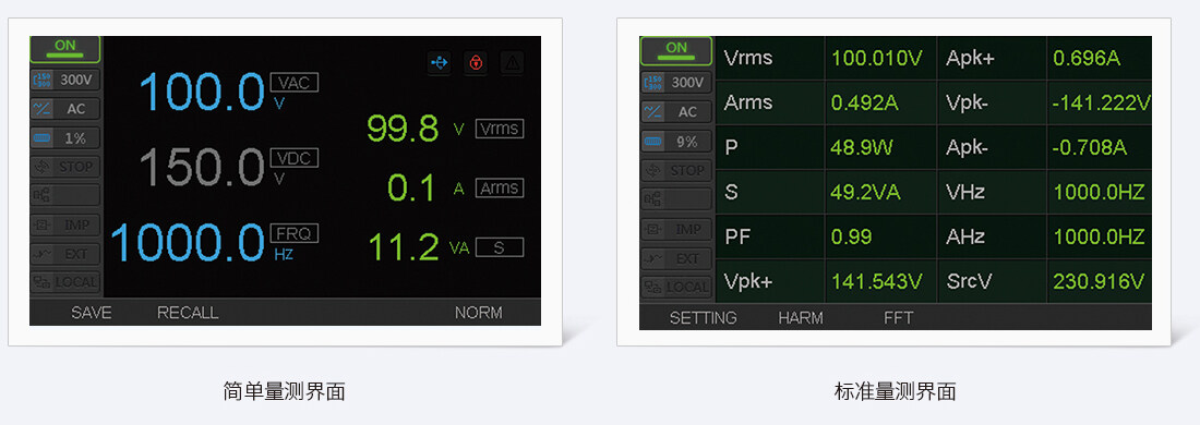 高性能可編程交流電源集成功率計,可實現(xiàn)電氣參數(shù)的精準量測,如電壓、電流、頻率、有功功率、視在功率、諧波等,同時具備高達 99次次諧波分析。集成功率計與電源共用內(nèi)部傳感器和線路,較常規(guī)電氣量測,顯著節(jié)省測試設備成本和接線時間。
