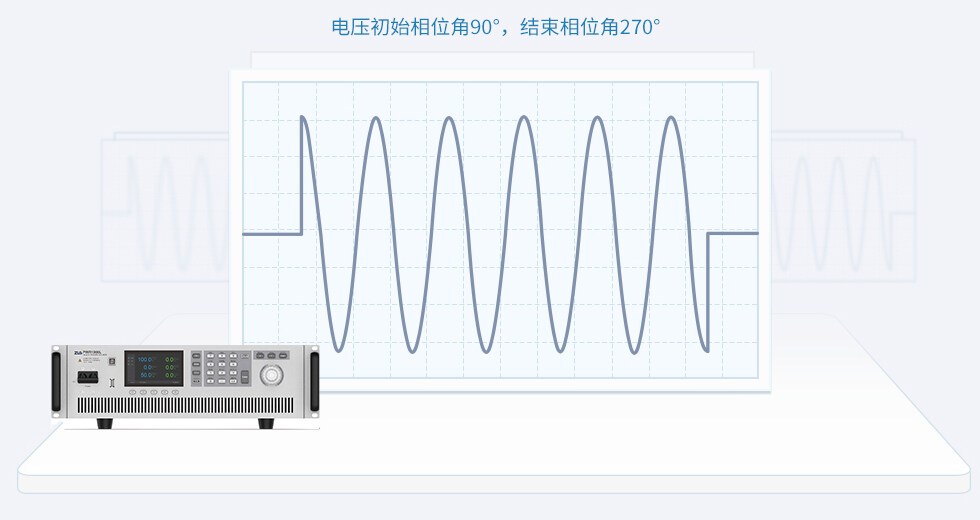 高性能可編程交流電源可設定輸出電壓初始相位與結束相位角,常規(guī)應用是將初始相位設置為90度,驗證電子設備開機最大啟動峰值電流和浪涌電流,關斷后電壓下降至安全電壓的時間。
