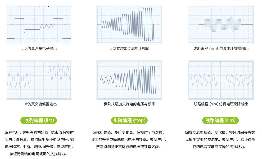 高性能可編程交流電源集成List、 Step、sim( 線路) 仿真等功能,可模擬電壓突升突降、中斷等多種類型電網(wǎng)電壓波動輸出,為電子產(chǎn)品性能和功能的驗證提供多種類型的電源輸入,以驗證待測物對電網(wǎng)波動的抗擾能力。對于不復雜編輯的電壓,可以將波形文件導入交流電源,交流電源能完整還原輸出,尤其適合于戶外光伏逆變器,通訊UPS等產(chǎn)品。