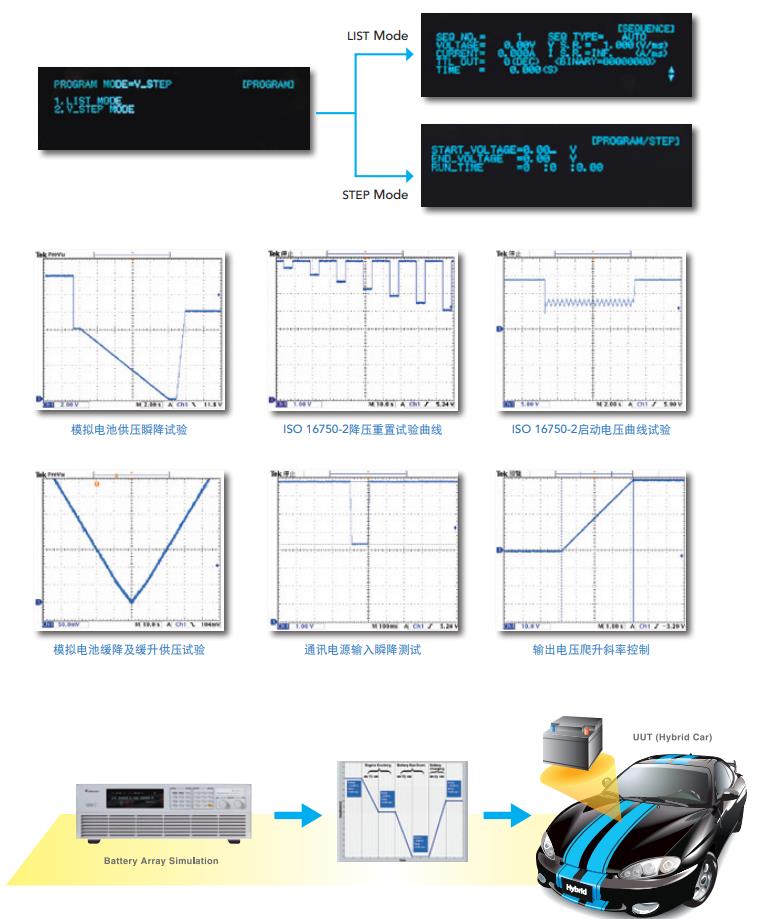 車用法規ISO 16750-2、VW 80000、GS 95024-2-1及LV123電力負載試驗應用除了整合國際ISO16750-2及車廠GS95024-2-1及VW80000標準外,納入1V123干此汽車環境電力負載試驗軟件,1V123為歐系各大車廠編訂干新能源汽車的電氣特性測試,針對其高壓系統零件,定義其操作電壓范圍內的狀態標準,此圖形化人機接口軟件可簡易聯機控制直流電源供應器提供圖形化測試曲線進行測試,此非常適合研發及品保單位對LED頭燈、車用音響、GPS、高壓電池系統、逆變器、DC/DC高低壓轉換器、車載充電器.等車用電子產品做長時間性能及穩定性驗證。