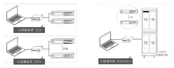 IT-M3300具備靈活的多通道的設計架構,用戶可將多臺IT-M3600組成多通道源載系統,每臺儀器界面都會顯示通道號。將其中一臺電源的通訊接口與PC端連接,就可在上位機軟件中獨立控制系統中的每臺電源,每個通道可完全獨立操作。IT-M3300最多可達16*16通道,137U機柜內就可配置64通道,透過并聯功能可支持多種不同功率的待物測試,不但用戶的使用更為彈性,設備的使用率也大幅提高。