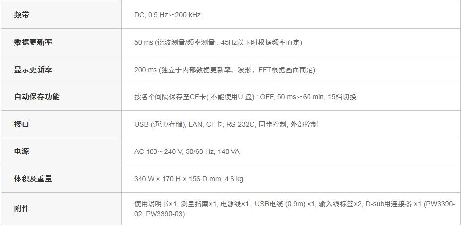 PW3390高功率分析儀,全新高功率分析儀,日本日置新產品PW3390超過上一代產品3390,實現了業界界別的功率基本±0.09%,可以進行高的功率分析。此外,測量頻帶擴大至200kHz,而且還新增了相位補償功能。PW3390在節能/新能源相關的電氣設備的開發、生產、維護管理等方面將作出巨大貢獻。測量馬達、變頻器的功率轉換效率的功率分析儀實現高級別的功率基本精度±0.04%rdg.±0.05%f.s.;200kHz的測量頻帶,高頻也很穩定的振幅和相位精度;實現機身小型/輕巧化,滿足現場和研究室的高精度測量;50ms高精度高速運算過渡狀態的功率,同時并行運算諧波分析、瞬態波形、干擾分析和效率損耗等其他所有項目多個系統的同時測量中可最多采集8臺同步的數據;使用鉗形電流傳感器進行簡單的功率測量;適用于新燃油效率標準WLTP的電流、功率平衡測量(適用范圍擴大至 -10°C ー 40°CWLTP中追加了 -7°C低溫試驗亦可使用)