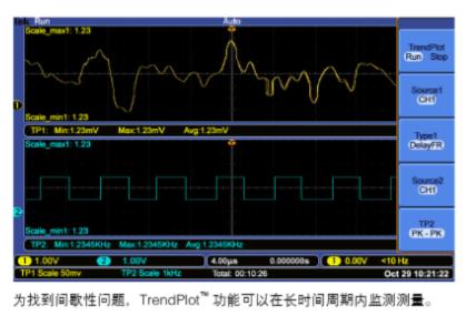 間歇性問題可能很難評估,因為它們不會經常重復,因此很難捕獲。TrendPlot功能在長時間周期內繪制測量值,幫助找到這些問題。選擇在任意一條通道或兩條通道上要捕獲的測量,然后設置示波器,連續監測這些測量,在顯示畫面上繪制數據,同時把信息保存到U盤中。視不同的示波器設置,您將能夠捕獲幾分鐘、幾小時、甚至幾天的數據唯一的限制是U盤的容量。