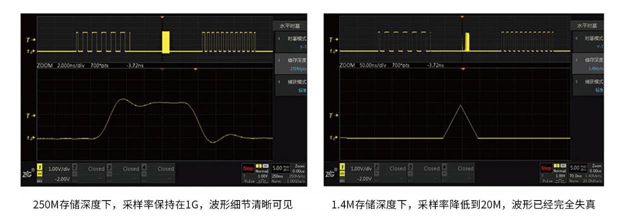 如果存儲深度能夠做到足夠大,就能保持較高的波形采樣率,則觀察到的波形會更加真實、細膩。通用研發(fā)型示波器創(chuàng)新性地采用DDR3存儲技術(shù),配合大規(guī)模的FPGA器件,通過全硬件加速和多線程并行處理,存儲深度最高可達250M !在觀察長時間波形時也不丟失波形細節(jié)。