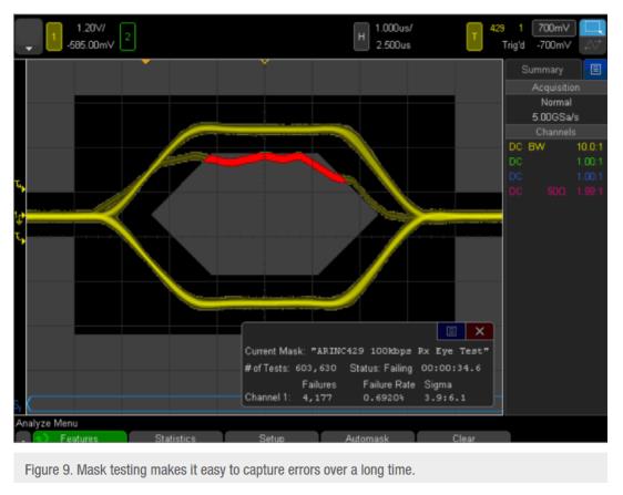 模板(掩碼)極限測試在驗證測試中非常有用,無論是在研發還是制造中。掩碼測試功能非常簡單地圍繞信號創建掩碼。如果信號中有錯誤,則會違反掩碼,并使用紅色標記錯誤和通過/失敗統計數據,如圖所示。這是執行通過/失敗測試并確定信號在很長一段時間內是否經歷錯誤的最有效方法。