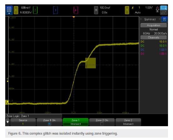 更快的波形刷新速度可以捕獲很少的事件,那么下一步就是隔離它們。由于需要多步處理和必要的計算或猜測工作,因此處理這種罕見的事件通常會很麻煩。InfiniiVision 3000T x系列可以通過簡單地揮揮手指創建一個區域來隔離信號事件。從這里開始,你唯一要做的選擇就是你是否想要信號與那個區域相交,這些復雜事件就這樣被觸發了。此外,你還可以使用區域觸發功能來隔離串行總線的部分。例如,如果你看到大量的CAN總線產生錯誤,可以通過在其上繪制一個框來輕松地隔離它。