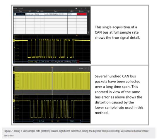 當捕獲脈沖或分組信息(如串行總線)時,在許多情況下,必須捕獲數百次這些數據包。在大多數示波器上,包括Tektronix 3系列,唯一的方法是縮小你的信號(增加你的時間基數)。然而,問題是這恰好降低了你的采樣率。如此,當你試圖分析每個數據包時,你得到的捕獲都是扭曲的而且毫無用處。