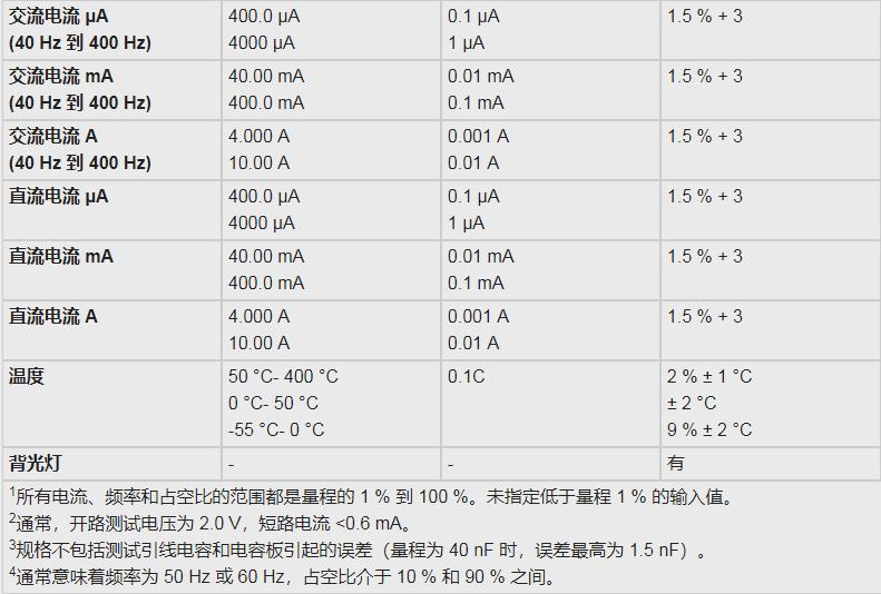 校準后可保持<span font-size:14px;background-color:#ffffff;"=""> 年的精度,工作溫度為 18 °到 28 °C,相對濕度為 0 % 到 75 %。精度規格形式如下: ±(讀數 % + 最低有效位數)。