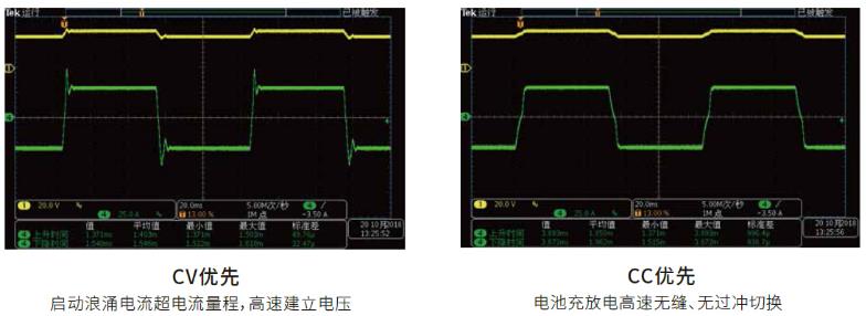 IT6000B系列延續ITECH提出的CC/CV 優先權概念,持續幫助用戶解決長期測試應用中的各種嚴苛問題,使需求電源高速或者無過沖等應用,變得更加靈活。用戶可以選擇CC/CV 環路的響應速度以及環路工作模式,來決定輸出是電壓高速模式還是電流無過沖模式,適用于諸如大功率集成電路的測試、充放電測試和汽車電子的電源瞬變仿真和表征等。